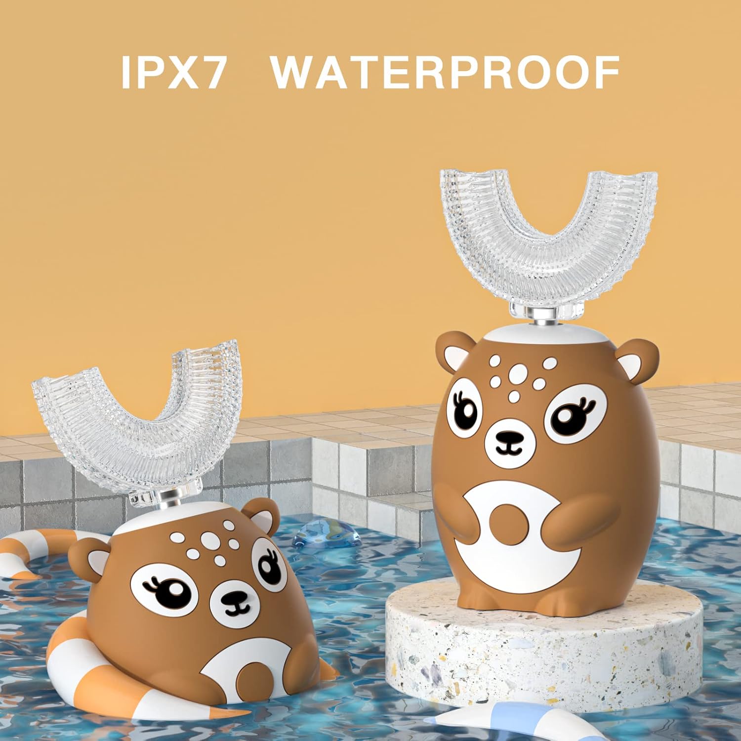 Kids Electric Toothbrushs U Shaped Sonic Automatic Toothbrush with 4 Brush Heads, Six Cleaning Modes,Cartoon Deer Modeling, Full Mouth Toothbrush for Baby