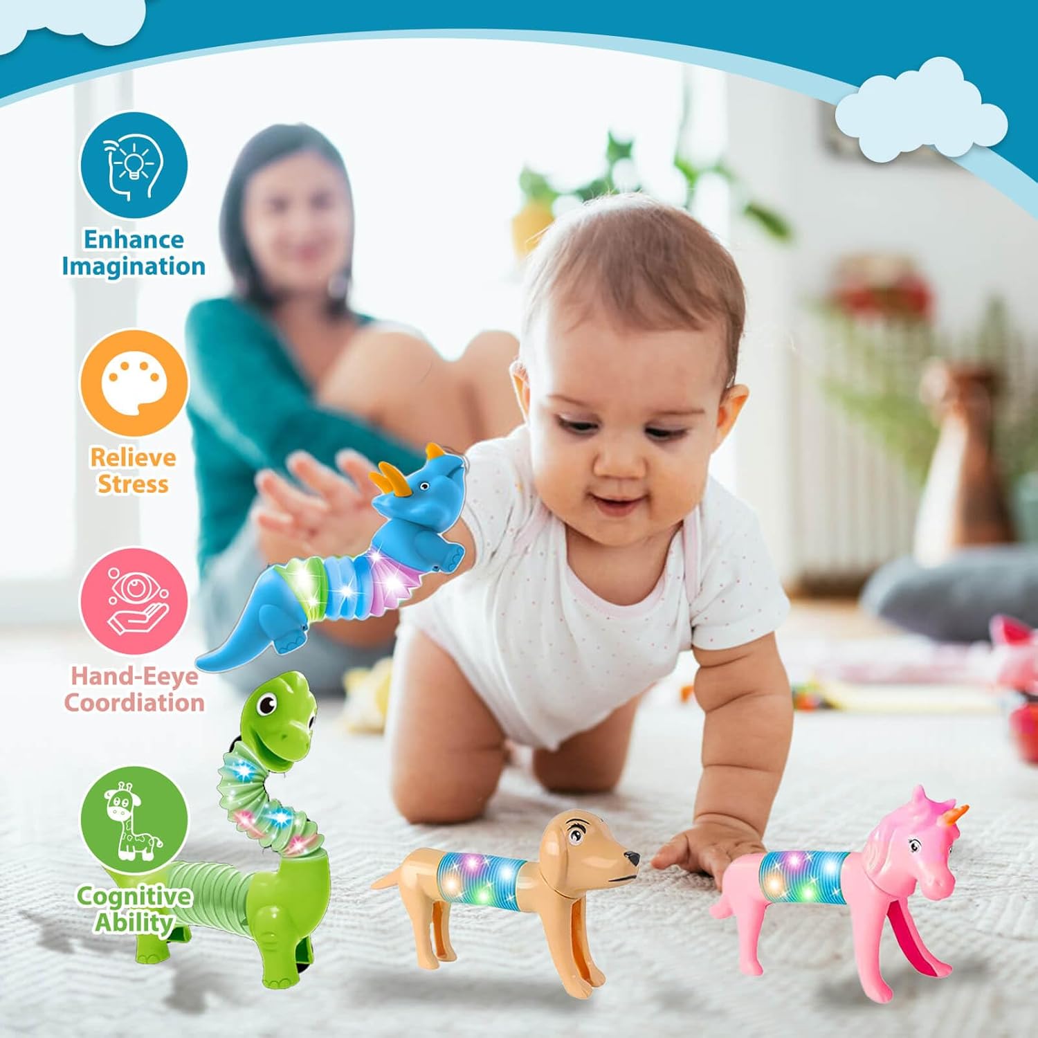 - Pop Tubes LED Light Toys: Pop tubes fidget toys with led lights design;You just need to tap on the tube and it will flash;You can create your own light show and party at dark
