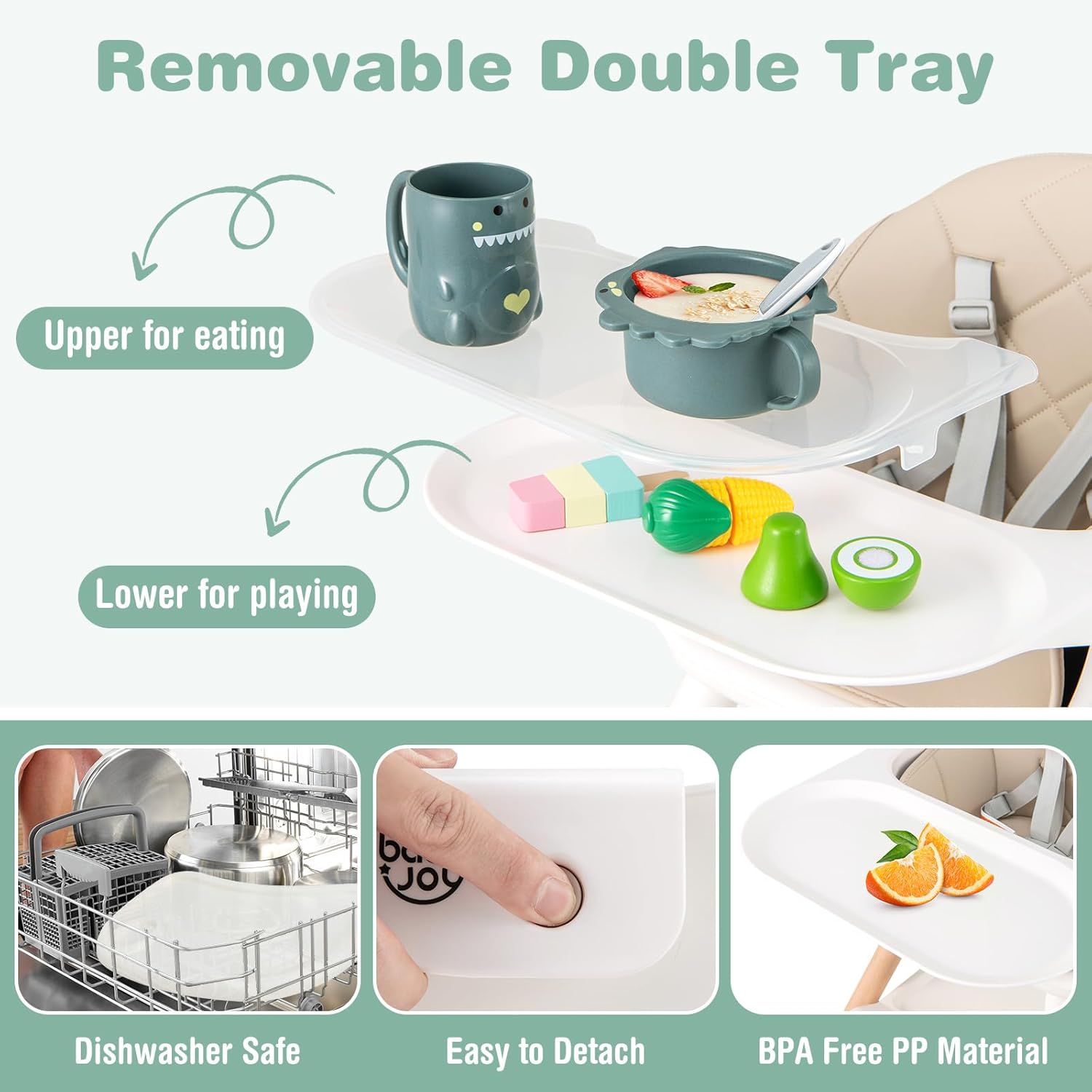 - Removable Double Tray: This infant feeding chair is equipped with a double tray that can be easy to detach according to your needs. The upper tray is suitable for eating and feeding, and the lower tray is ideal for playing. The tray is made of BPA free PP material and harmless to the health of your baby.