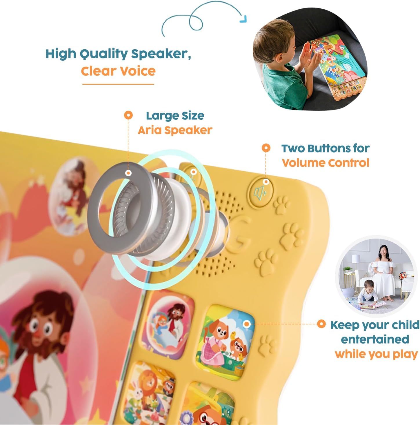 - 2 volume control buttons allow easy adjustment of volume: Joyful bible songs for young hearts: This interactive sound book introduces little ones to Jesus’ teachings and Bible proverbs through colorful illustrations and joyful songs, making it ideal for family bonding and as a thoughtful gift for Christmas, Baptisms, Easter, and more.
