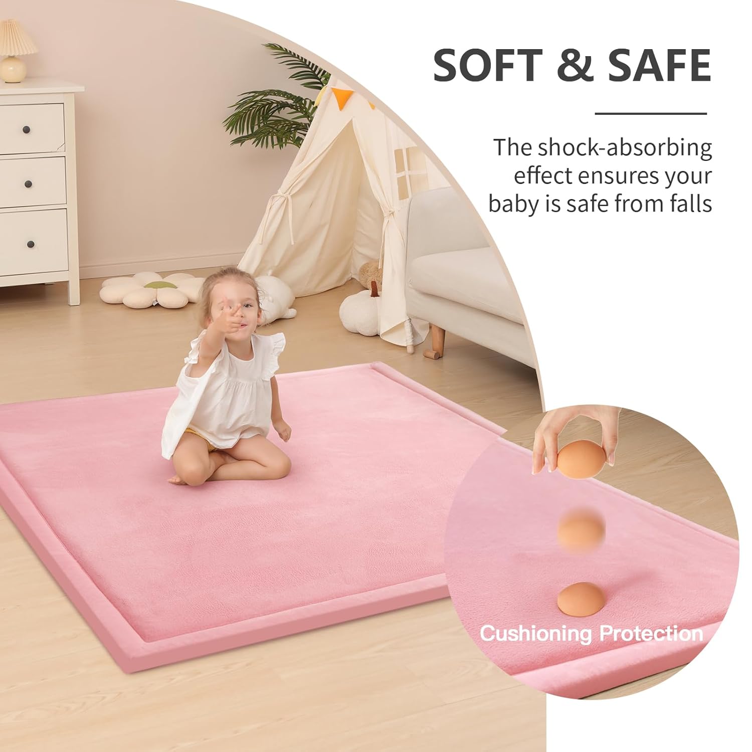 - 【Perfect Fit for Playpens & Hardwood Floors】Measuring 50×50 inches, this playpen mat is an ideal match for baby playpens, play tents, or as a nursery rug. The thick cushioning protects against bumps and falls, making it perfect for active toddlers and infants. It also serves as a muscle mat, offering a comfortable surface for little ones to build strength and coordination. The elegant, simple design blends seamlessly into any playroom, bedroom, or living space.